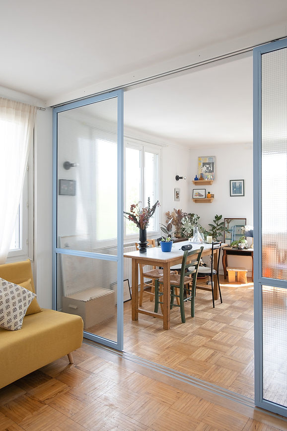 Dans le séjour, les trois vantaux d’une verrière en acier laqué bleu ciel et verre armé petite maille coulissent sur trois rails encastrés dans le parquet. Quotidiennement largement ouvert, le séjour peut se diviser en deux espaces afin d’héberger la famille et les amis ou coudre et travailler au calme.