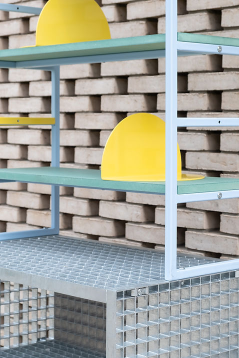 Comme une synthèse mobilière de l’ensemble de l’appartement, une double bibliothèque mobile emprunte à l’esthétique de la cuisine et de la verrière tout en clamant sa propre identité : des plateaux en MDF vert comme le placard courbe, un soubassement en caillebotis comme les étagères hautes de la cuisine, du tube acier carré comme la structure des modules, un laquage bleu ciel comme la verrière, auxquels on ajoute quelques accessoires laqués jaune en contrepoint pour acidifier la recette !